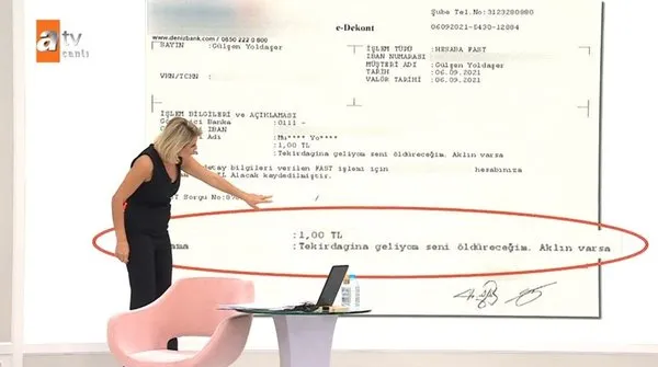 Gülşen Hanım, Mustafa Bey'in kendisine 1 TL para yatırdığını açıklama kısmına da kendisini tehdit ettiğini söyledi ve bunu da canlı yayında ispatladı.