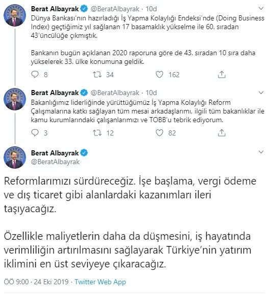 Bankanın bugün açıklanan 2020 raporuna göre Türkiye'nin 10 sıra daha yükselerek 33. sıraya yerleştiğini bildiren Albayrak, şunları kaydetti: "Bakanlığımız liderliğinde yürüttüğümüz iş yapma kolaylığı reform çalışmalarına katkı sağlayan tüm mesai arkadaşlarımı, ilgili tüm bakanlıklar ile kamu kurumlarındaki çalışanlarımızı ve TOBB'u tebrik ediyorum. Reformlarımızı sürdüreceğiz. İşe başlama, vergi ödeme ve dış ticaret gibi alanlardaki kazanımları ileri taşıyacağız. Özellikle maliyetlerin daha da düşmesini, iş hayatında verimliliğin artırılmasını sağlayarak Türkiye'nin yatırım iklimini en üst seviyeye çıkaracağız."