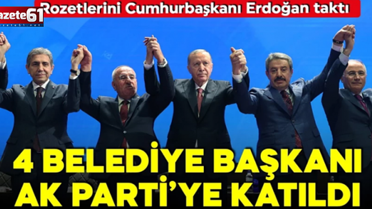 Cumhurbaşkanı Recep Tayyip Erdoğan, AK Parti'ye katılan belediye başkanlarına rozetlerini taktı.Başkan Erdoğan, AK Parti Merkez Karar ve Yönetim Kurulu (MKYK) toplantısı öncesinde partisine katılan 4 belediye başkanına rozetlerini taktı. Konya Çumra Belediye Başkanı Mehmet Aydın ve Yozgat Kadışehri Belediye Başkanı Davut Karadavut Yeniden Refah Partisi'nden, Şırnak İdil Karalar Belde Belediye Başkanı Hasan Turgut ve Çorum Ortaköy Aştağul Belde Belediye Başkanı Şenol Öncül ise CHP'den AK Parti'ye katıldı.