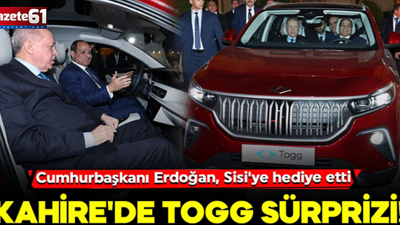 Cumhurbaşkanı Recep Tayyip Erdoğan, Mısır'ın başkenti Kahire'de, Mısır Cumhurbaşkanı Abdulfettah es-Sisi'ye Türkiye'nin yerli elektrikli otomobili Togg'u hediye etti. Araca binerek inceleyen iki lider kısa bir tur da attı.