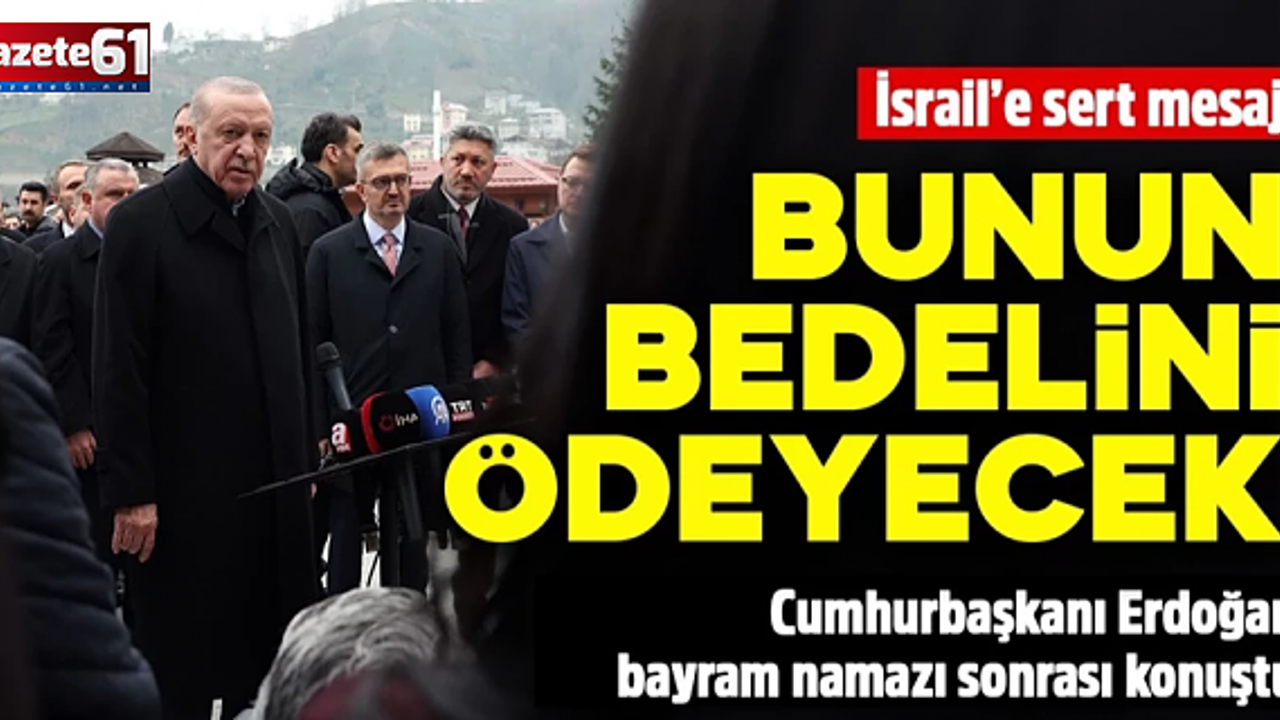Cumhurbaşkanı Erdoğan, memleketi Rize'de Güneysu Merkez Camii'nde kıldığı bayram namazının ardından açıklamalarda bulundu. Konuşmasında İsrail'e sert tepki gösteren Erdoğan, "Siyonist İsrail malum yüzlerce, binlerce insanı katletti. İnşallah bunun bedelini de ödeyeceğinden hiç şüphem yok" dedi.