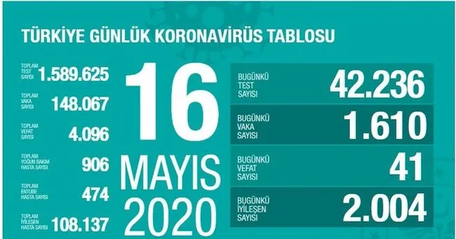 Sağlık Bakanı Fahrettin Koca, 16 Mayıs tarihine ait Türkiye'deki coronavirüs vaka ve vefat sayısını açıkladı. Bakan Koca'nın paylaştığı veriye göre Türkiye'de bugün 1610 yeni vaka tespit edildi, 41 kişi ise hayatını kaybetti. Bugün 2004 kişi iyileşti ve toplam iyileşen sayısı 108.137'ye yükseldi.Sağlık Bakanı Fahrettin Koca, 16 Mayıs tarihine ait Türkiye'deki coronavirüs vaka ve vefat sayısını açıkladı. Bakan Koca'nın paylaşımına göre Türkiye'de bugün 1610 yeni vaka tespit edildi, 41 kişi ise hayatını kaybetti.