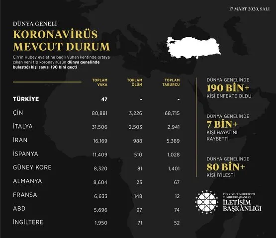 İletişim Başkanlığı, dünya genelinde koronavirüsün görüldüğü ülkelerdeki vaka, ölüm ve taburcu sayılarını açıkladİletişim Başkanlığının, Twitter hesabından yapılan paylaşımda, Çin'in Hubey eyaletine bağlı Vuhan kentinde ortaya çıkan yeni tip koronavirüsün (Kovid-19) dünya genelinde bulaştığı kişi sayısının 190 bini geçtiği, 7 binden fazla kişinin hayatını kaybettiği, 80 binden fazla kişinin de iyileştiği belirtildi.