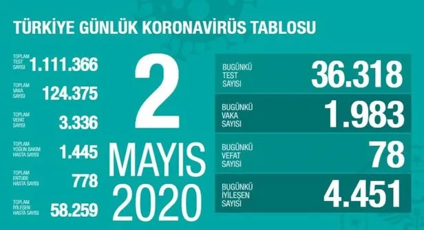 Sağlık Bakanı Fahrettin Koca 2 Mayıs koronavirüs (Kovid-19) vaka, iyileşen hasta, ve vefat sayılarını açıkladı. Son 24 saatte 4 bin 451 kişinin daha iyileşmesiyle Kovid-19 tedavisi tamamlananların sayısı 58 bin 259'a ulaştı.Sağlık Bakanlığı, son 24 saatte 1983 kişiye yeni tip koronavirüs (Kovid-19) tanısı konulduğunu, 78 kişinin hayatını kaybettiğini, toplam vaka sayısının 124 bin 375, toplam can kaybının 3 bin 336 olduğunu, 4 bin 451 kişinin daha iyileşmesiyle Kovid-19 tedavisi tamamlananların sayısının 58 bin 259'a ulaştığını açıkladı.