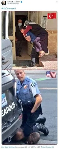 Hollandalı siyasetçi Doorn, ırkçılıkla gündeme gelen Amerikan polisinin bir siyahiyi ezdiği kare ile Türk polisinin bir vatandaşı sırtında taşıdığı kareyi paylaşarak 'Yorum yok' anlamına gelen 'No comment' sözünü yazdı. Doorn'un tweeti gururlandırırken Amerika'daki ırkçılığı, Türkiye'deki alçak gönüllülüğü gözler önüne serdi.