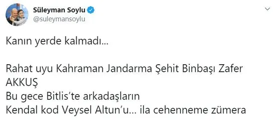 İçişleri Bakanı Süleyman Soylu, Jandarma Binbaşı Zafer Akkuş'un şehit edildiği olayın faillerinden 'Gri' listede aranan terörist Veysel Altun'un etkisiz hale getirildiğini bildirdi. İçişleri Bakanı Süleyman Soylu sosyal medyadan duyururken: "Kanın yerde kalmadı... Rahat uyu Kahraman Jandarma Şehit Binbaşı Zafer AKKUŞ Bu gece Bitlis’te arkadaşların Kendal kod Veysel Altun’u… ila cehenneme zümera" ifedelerine yer verdi