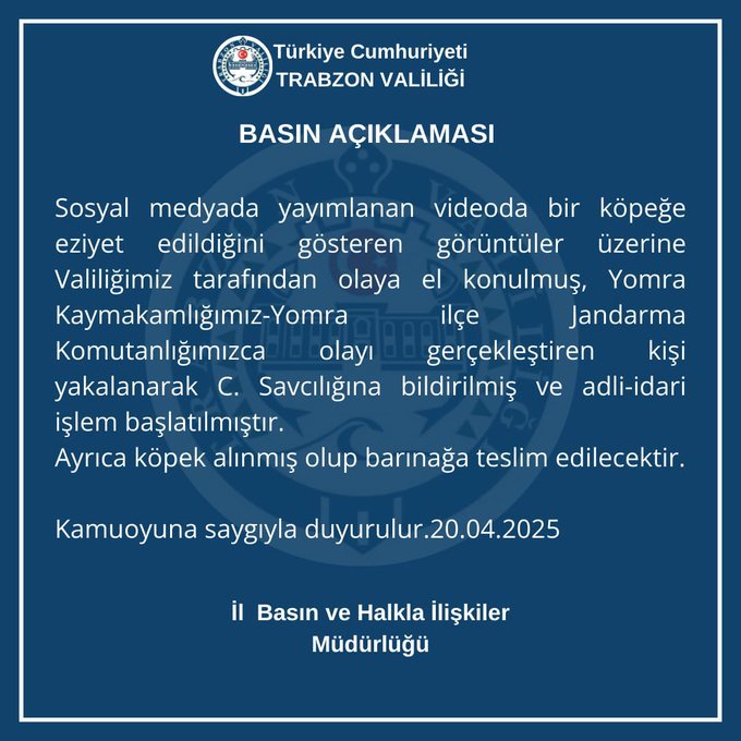 Trabzon Valiliği, tepkilere yol açan köpeğe halatlı şiddet ile ilgili yazılı açıklama yaptı. Açıklamada, “Sosyal medyada yer alan, bir köpeğe eziyet edildiği yönündeki görüntüler üzerine Valiliğimizce derhal harekete geçilmiştir. Yomra Kaymakamlığımız koordinasyonunda, Yomra İlçe Jandarma Komutanlığımız tarafından yürütülen çalışmada, olayı gerçekleştiren şahıs tespit edilerek yakalanmış ve Cumhuriyet Savcılığına bildirilmiştir. Söz konusu şahıs hakkında adli ve idari işlem başlatılmıştır" denildi.