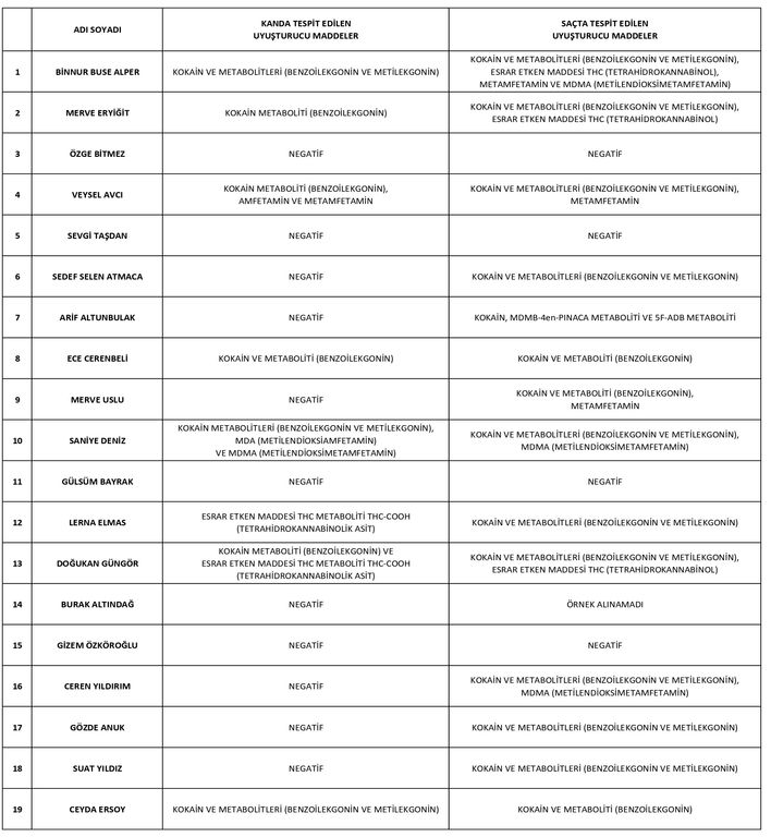 İstanbul Cumhuriyet Başsavcılığı tarafından ünlülere yönelik uyuşturucu operasyonu kapsamında, gözaltına alındıktan sonra Adli Tıp Kurumu tarafından kan ve saç örnekleri alınan 19 şüphelinin sonucu savcılık dosyasına ulaştı.