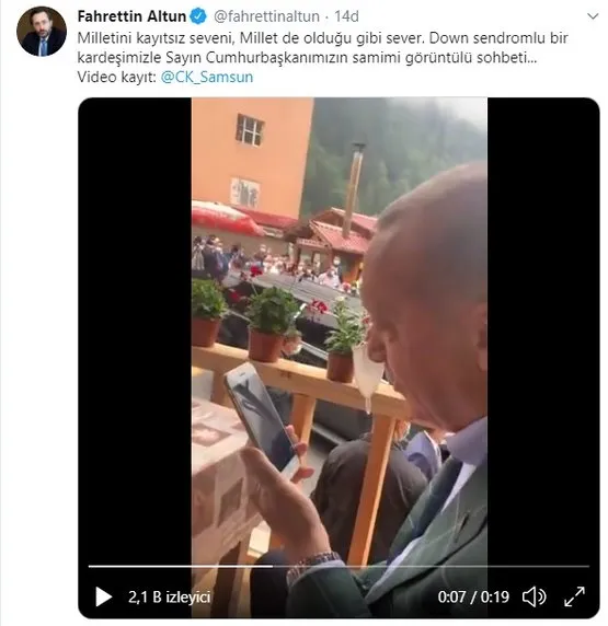 AK Parti Genel Başkan Yardımcısı Çiğdem Karaaslan tarafından kaydedilen görüntüleri, İletişim Başkanı Fahrettin Altun sosyal medya hesabından paylaştı.Altun, paylaşımında, "Milletini kayıtsız seveni, millet de olduğu gibi sever. Down sendromlu bir kardeşimizle Sayın Cumhurbaşkanımızın samimi görüntülü sohbeti." ifadesini kullandı.