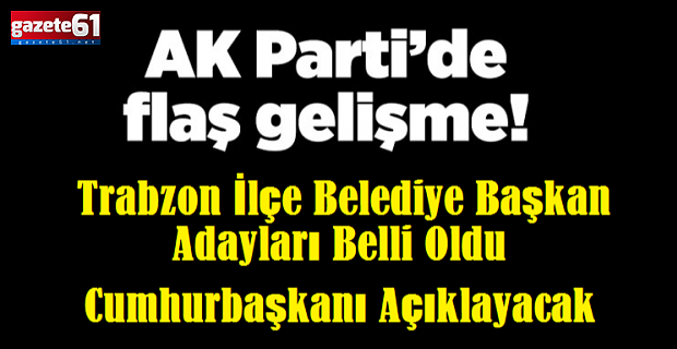 Trabzon'da 31 Mart seçimleri öncesinde ilçe belediye başkan adaylarının açıklanmasında sona gelindi.İki ilçede yapılan anket sonuçlarının ardından15 ilçenin adayları belirlendi. AK Parti'de Trabzon Büyükşehir Belediye Başkan adayı Ahmet Metin Genç'in ardından Trabzon'un 15 ilçe adayı 3 Şubat cumartesi günü yapılacak toplantı ile duyurulacak. Cumhur İttifakı kapsamında 3 ilçede MHP adayının destekleneceği açıklanmıştı.