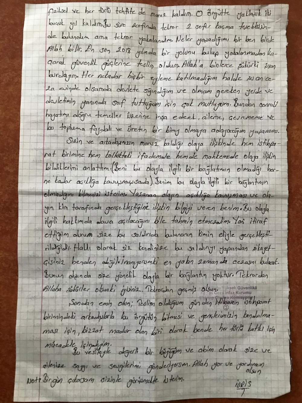 “Sayın Abdullah Bey, öncelikle dava sürecine ilginiz ve bu vesileyle şahsıma göndermiş olduğunuz mektubu ve benim için bir o kadar anlamlı olan hediyeyi (TÜRK BAYRAĞI ROZETİ) aldım. Şahsım adına göndermiş olduğunuz kıymetli AYYILDIZLI ROZETİ GURUR ve ONURLA takacağımdan ve bundan ötürü onure olduğumdan şüpheniz olmasın. Bu düşünceli ve duyarlı davranışınız için bütün samimiyetim ve en kalbi duygularımla şükranlarımı sunuyorum. Bu samimiyetiniz ve duyarlılığınız vesilesiyle bende bütün içtenliğimle size bu mektubu yazma gereği hissettim. Yazdıklarınızdan anladığım kadarıyla bir birey olarak bu ülkenin yaşanan sorunlarına duyarlı ülkesini ve milletini seven, bu halkın gençlerinin bilinçlenmesini, eğitilmesini düşünen, yanlış ve hatalı yollara meyletmemesi için uğraşıp sahip çıkarak bu tür toplumsal konulara yönelik farkındalık yaratan bilinçli bir kişiliğe sahipsiniz. Bu sebepten ötürü değerli bir büyüğüm olarak beni anlayacağınızı umut ediyorum. Takdir edersiniz ki, bireyler bazen yanı başlarındaki gerçekleri görüp anlamakta zorluk çeker ve tam olarak anlamlandıramaz. Buda bireyin doğruyu yanlıştan, hakkı batıldan ayırt etmemesine vesile olur. Bu tür zorlu süreçlerde insana doğru yolu gösteren birilerinin olmayışı ve bir anlık boşluk bireyi hatalı davranışlara sevk eder. Böyle bir süreçte bireylerin bu boşluğunu yalan yanlış sözlerle fırsata dönüştüren kan emicilerin tuzağına düşmek kaçınılmaz olabiliyor. Benim de bu örgüt bataklığına sürüklenişim böyle bir dönem de oldu. Şahsım olarak bu örgüte katıldıktan çok kısa bir süre zarfında gerçekleri görmüş ve orda olmamam gerektiğinin farkına varmıştım. Bu kararla defalarca yüzleştim. İçinde olduğum durumu örgüt mensuplarına söyleyerek ayrılmak istediğimi beni aileme göndermelerini söyledim. Bunu belirtmem üzerine örgüt mensuplarınca tutuklandım. Bunun üzerine psikolojik fiziksel ve her türlü tehdide maruz kaldım. O örgütte yaklaşık iki buçuk yıl kaldım. Bu süre zarfında tekrar 2 sefer kaçma teşebbüsünde bulundum ama tekrar yakalandım. Neler yaşadığımı bir ben bir de Allah bilir. En son 2018 yılında bir yolunu bulup yakalanmadan kaçarak güvenlik güçlerine teslim oldum. Allah’a binlerce şükür ki şu an buradayım. Her ne kadar hiçbir eyleme katılmadığım halde şu an cezaevinde olsam da devlete sığındığım olmam gereken yerde ve devletimin yanında saf tuttuğum için çok mutluyum. Bundan sonraki hayatımı doğru temeller üzerine inşa ederek, aileme, çevreme ve bu topluma faydalı ve üreten bir birey olmaya adayacağım yaşamımı. Sizin ve arkadaşınızın maruz kaldığı olaya ilişkin de hem istihbarat birimine hem de kolluktaki ifademde hem de mahkemede olaya ilişkin bildiklerimi anlattım. (Benim bu olayla bir bağlantım olmadığı her ne kadar açıklığa kavuşmuşsa da) benim bu olayla ilgili bir bağlantım olmadığını bilmenizi isterim. Yaşanan olayın açıklığa kavuşması ve olayın kim tarafından gerçekleştiğine ilişkin bilgiyi veren benim. Bu olayla ilgili hakkımda dava açılacağını bile tahmin etmezdim. Yani itiraf ettiğim durum size bu saldırıda bulunanın kimin eliyle gerçekleştirildiğiydi. Haklı olarak siz kendinize bu saldırıyı yapandan şikayetçisiniz benden değil. İnanıyorum ki en yakın zamanda cezasını bulacak. Bunun dışında size yönelik olayla bir bağlantım yoktur. Tekrardan Allah’a şükürler olsun ki iyisiniz. Tekrardan geçmiş olsun. Şundan emin olun teslim olduğum günden itibaren istihbarat birimindeki arkadaşlarla bu örgütün bitmesi gençlerimizin kandırılmaması için, bizzat mağdur olan biri olarak bende her türlü katkı için mücadele içindeyim. Bu vesileyle değerli bir büyüğüm ve abim olarak size ve ailenize saygı ve sevgilerimi gönderiyorum. Allah yar ve yardımcınız olsun. NOT: Bir gün çıkarsam sizinle görüşmek isterim.