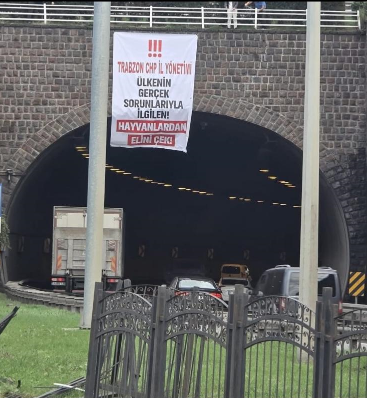 Trabzon'da CHP yönetimine hayvanseverlerde tepki geldi.Kentin en işlek tünellerine asılan pankartla CHP İl Başkanlığı uyarıldı. Pankartta, “Trabzon CHP İl Yönetimi, ülkenin gerçek sorunları ile ilgilen. Hayvanlardan elini çek” ifadelerine yer verildi.Pankartı asan hayvanseverler, sosyal medya hesapları üzerinden pankartın fotoğrafını paylaştı. CHP'ye yakın isimlerden oluşan bir grubun pankartı tünel üzerine astığı ve CHP İl Başkanaı Mustafa Bak'a mesaj verdiği ileri sürüldü.