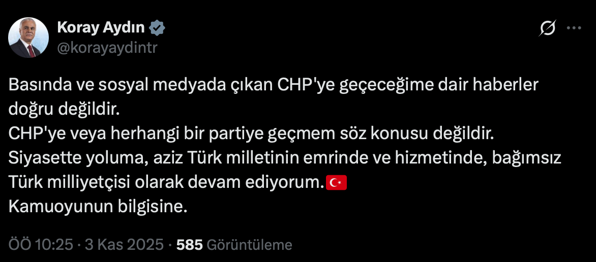 Trabzonlu siyasetçi Koray Aydın, sosyal medya hesabından yaptığı açıklamayla iddiaların doğru olmadığını duyurdu.