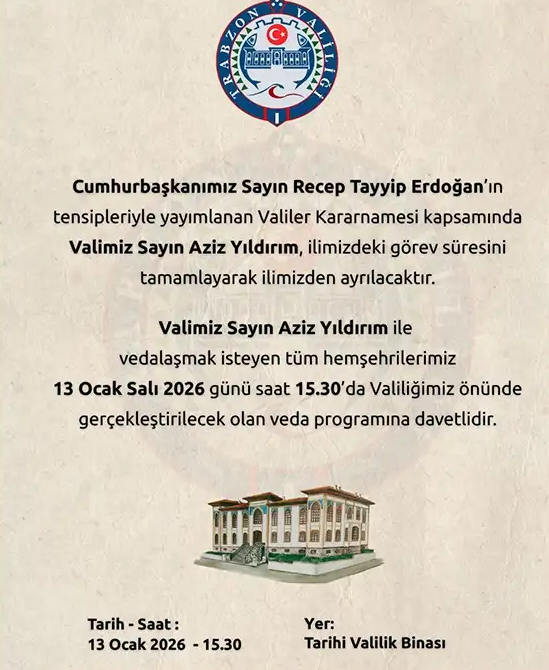 Trabzon Valiliği tarafından yapılan duyuruya göre, Vali Aziz Yıldırım ile vedalaşmak isteyen vatandaşlar, 13 Ocak Salı günü saat 15.30’da Tarihi Valilik Binası önünde düzenlenecek programa davet edildi.