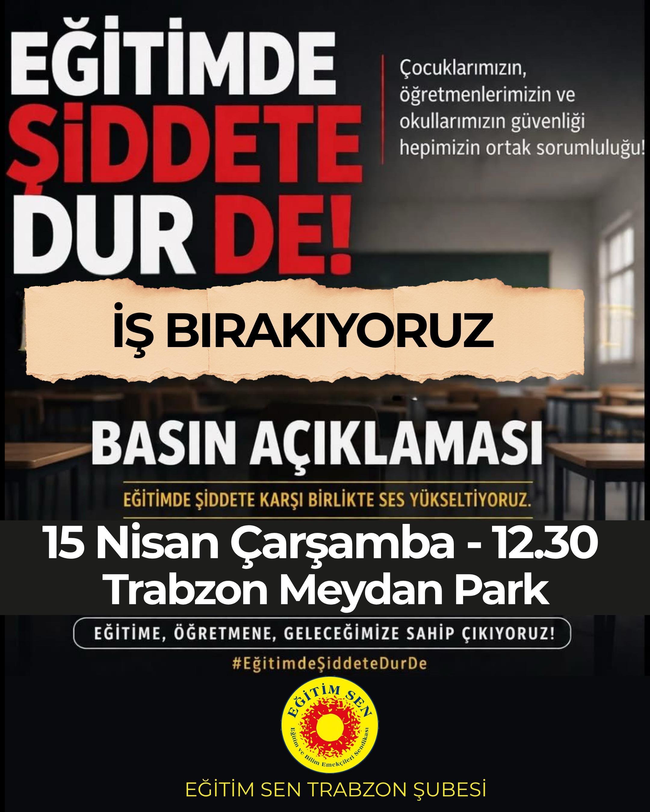 Trabzon’da eğitim çalışanları, okullardaki güvenlik sorununa dikkat çekmek için şehir merkezinde bir araya gelecek. Bugün saat 12.00'da Uzun Sokak girişinde bulunan Diyanet Yayınevi önünde toplanılacak olan eğitimciler, buradan başlayacak yürüyüşün ardından 12.30'da Meydan Parkında bir basın açıklaması yaparak taleplerini kamuoyuyla paylaşacak. Eğitimciler, okullarda güvenliğinin sağlanması vehuzurlu birer eğitim yuvası haline getirilmesi için bu eylemin kritik bir öneme sahip olduğunu vurguladı.