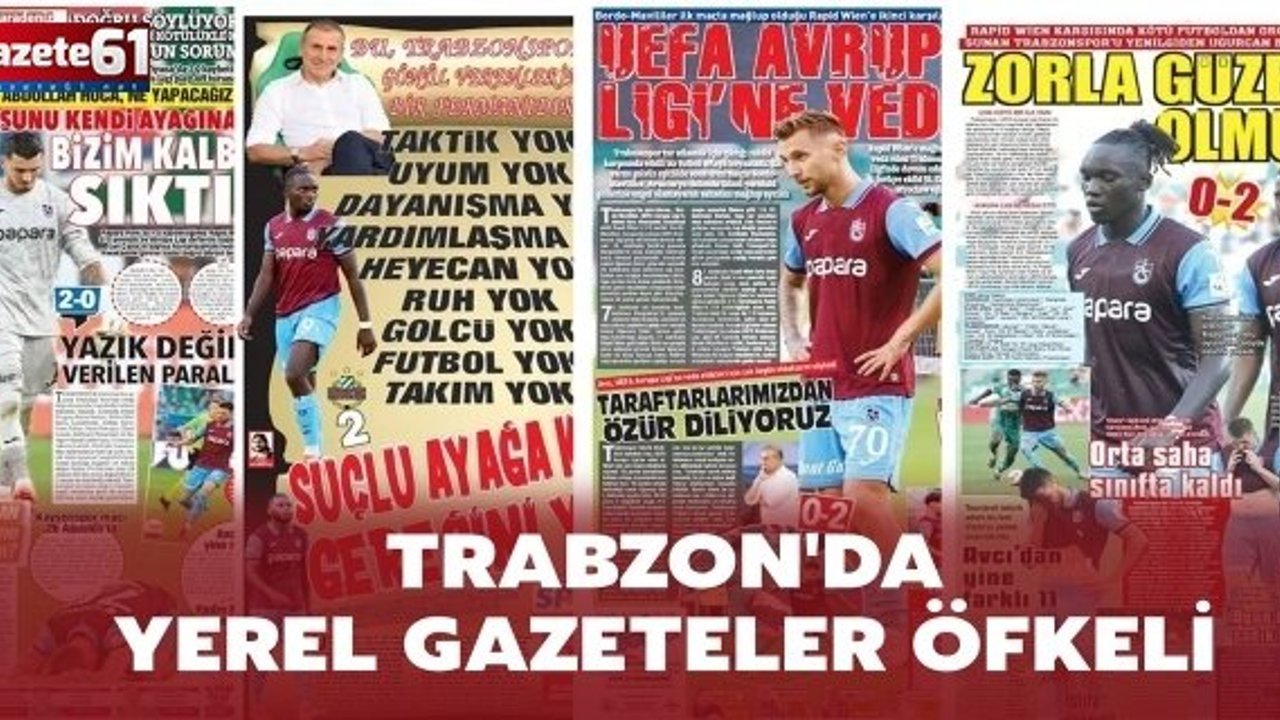 Trabzon'da yayın yapan yerel basın, Trabzonspor'un UEFA Avrupa Ligi'nden elenmesini manşetlerine farklı başlıklarla taşıdı.UEFA Avrupa Ligi 3’üncü Eleme Turu ilk maçında sahasında Avusturya temsilcisi Rapid Wien’e sahasında 1-0 mağlup olan Trabzonspor, dün akşamki rövanş maçında 2-0 mağlup olarak Konferans Ligi’ne kaldı. Bordo-mavililer UEFA Konferans Ligi’nde Play-Off turu oynayacak.