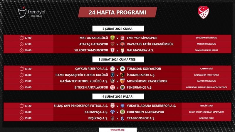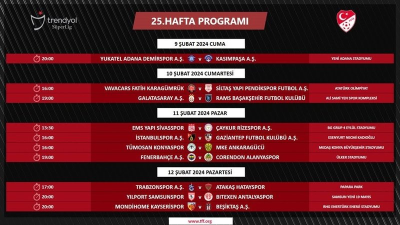 Ligin 25. haftasında ise maçlar 9-12 Şubat tarihleri arasında oynanacak.