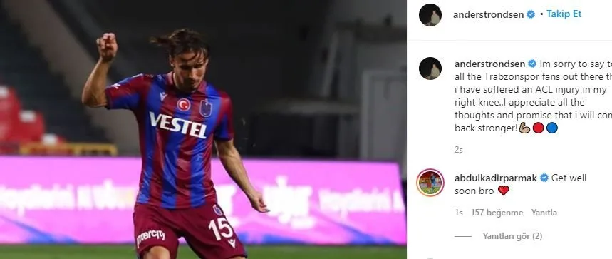 Trabzonspor'un yıldız futbolcu Trondsen'in sakatlandığı ve 6 ay sahalardan uzak kalacağı açıklanmıştı. Norveçli futbolcu Instagram hesabından yaptığı paylaşımda, "Tüm Trabzonspor taraftarlarına sağ dizimden sakatlık yaşadığımı söylediğim için üzgünüm. Tüm düşünceleri takdir ediyor ve daha güçlü bir şekilde döneceğime söz veriyorum" ifadelerini kullandı.