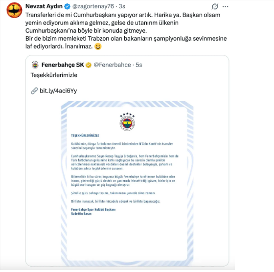 "Transferleri de mi Cumhurbaşkanı yapıyor artık? Harika ya. Başkan olsam yemin ediyorum aklıma gelmez, gelse de utanırım ülkenin Cumhurbaşkanı’na böyle bir konuda gitmeye. Bir de bizim memleketi Trabzon olan bakanların şampiyonluğa sevinmesine laf ediyorlardı. İnanılmaz."