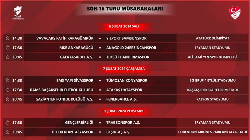 Ziraat Türkiye Kupası'nda son 16 turu takvimi açıklandı. TFF'den yapılan açıklamaya göre; Türkiye Kupası son 16 turu müsabakaları 6-7-8 Şubat tarihlerinde oynanacak. Türkiye Futbol Federasyonu; Ziraat Türkiye Kupası'nda oynanacak son 16 turu karşılaşmalarının maç takvimini açıkladı.
