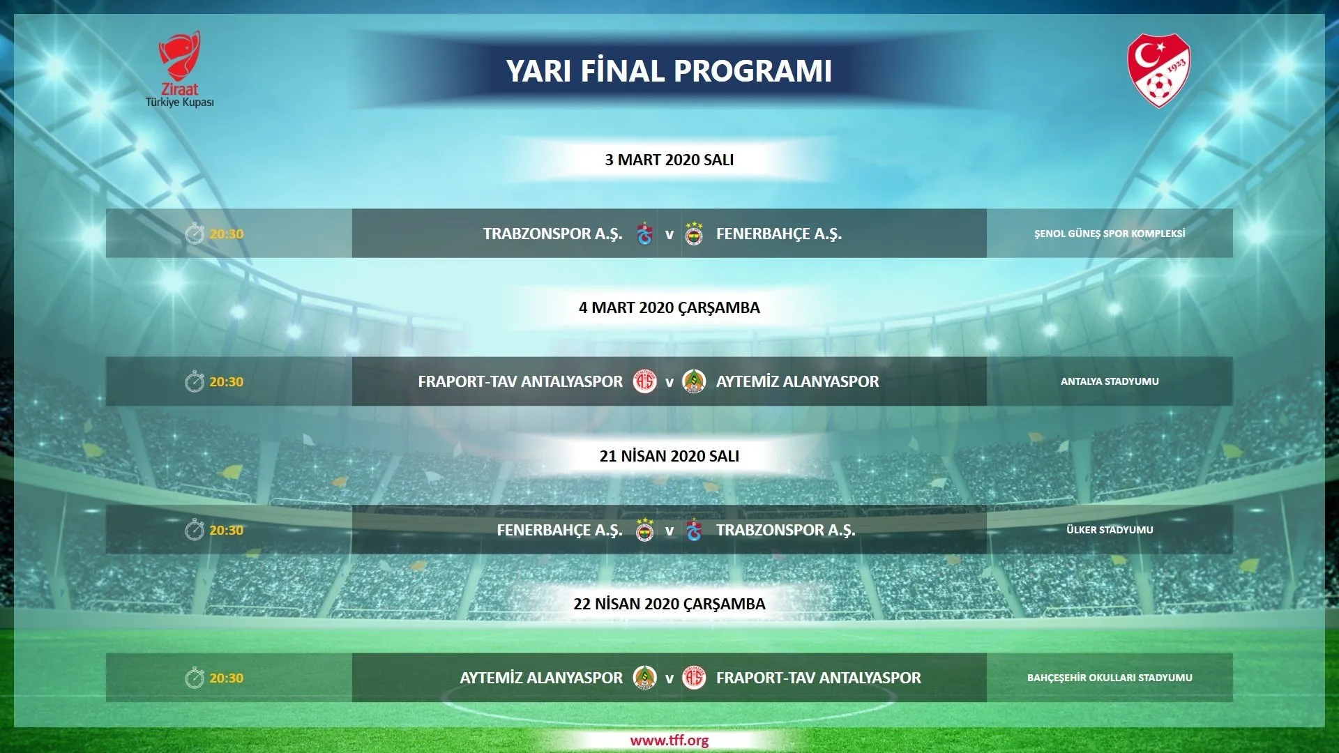 Türkiye Futbol Federasyonu, Ziraat Türkiye Kupası yarı final programını açıkladı. Trabzonspor'un Fenerbahçe'yi konuk edeceği zorlu maç 3 Mart Salı günü, rövanş karşılaşması ise 21 Nisan Çarşamba günü Kadıköy'de oynanacak. Yarı finalin diğer ayağında ise Antalyaspor ile Alanyaspor 4 Mart ve 22 Nisan tarihlerinde oynanacak.Ziraat Türkiye Kupası'nda finale çıkacak takımları belirleyecek eşleşmelerin oynanacağı tarihler duyuruldu.Türkiye Futbol Federasyonu, yarı final programını açıkladı. İlk maçlar 3-4 Mart, rövanşları ise 21-22 Nisan'da oynanacak.Trabzonspor'un Akyazı Stadyumu'nda Fenerbahçe'yi ağırlayacağı karşılaşma 3 Mart Salı günü 20.30'da başlayacak. Ezeli rakipler bu karşılaşmanın rövanşı için 21 Nisan Salı günü 20.30'da karşı karşıya gelecek.Yarı finalin diğer ayağında ise iki Akdeniz takımı final bileti için mücadele edecek. İlk maç Antalyaspor'un evinde 4 Mart Çarşamba günü 20.30'da, ikinci karşılaşma ise 22 Nisan Çarşamba günü saat 20.30'da oynanacak.Türkiye Kupası'nda tur atlayan takımlar, 5 Mayıs'ta Atatürk Olimpiyat Stadı'nda şampiyonluk için karşılaşacak.
