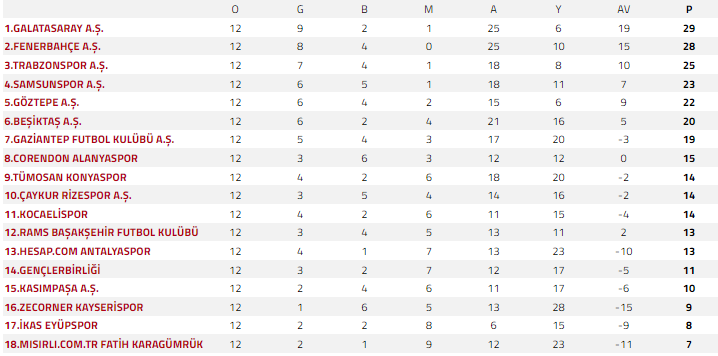 Trendyol Süper Lig'de 12. hafta müsabakaları tamamlandı ve milli araya girildi. 22 Kasım'a kadar ara verilen ligde liderlik yarışı ise kızıştı.Trendyol Süper Lig'de 12. haftada nefes kesen karşılaşmalar oynandı. Mücadelelerin ardından yeni puan tablosu da ortaya çıktı.Fenerbahçe zirvede yer alan Galatasaray'a bir puan yaklaşırkan sahasında Alanya ile berabere kalan Trabzonspor puan farkını 4'e indirdi.